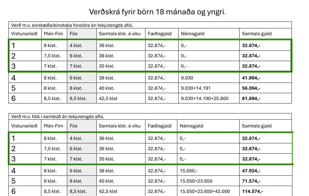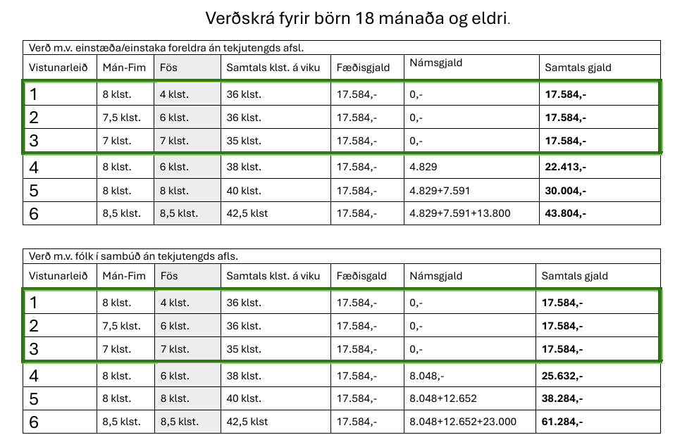 Gjaldskrá þessi miðast við að barn sé með lögheimili í Reykjavík. Leikskólagjald er innheimt fyrirfram.